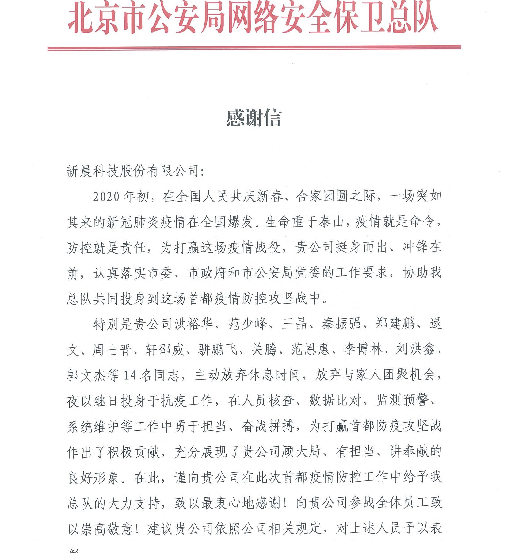 北京市公安局抗疫感谢信