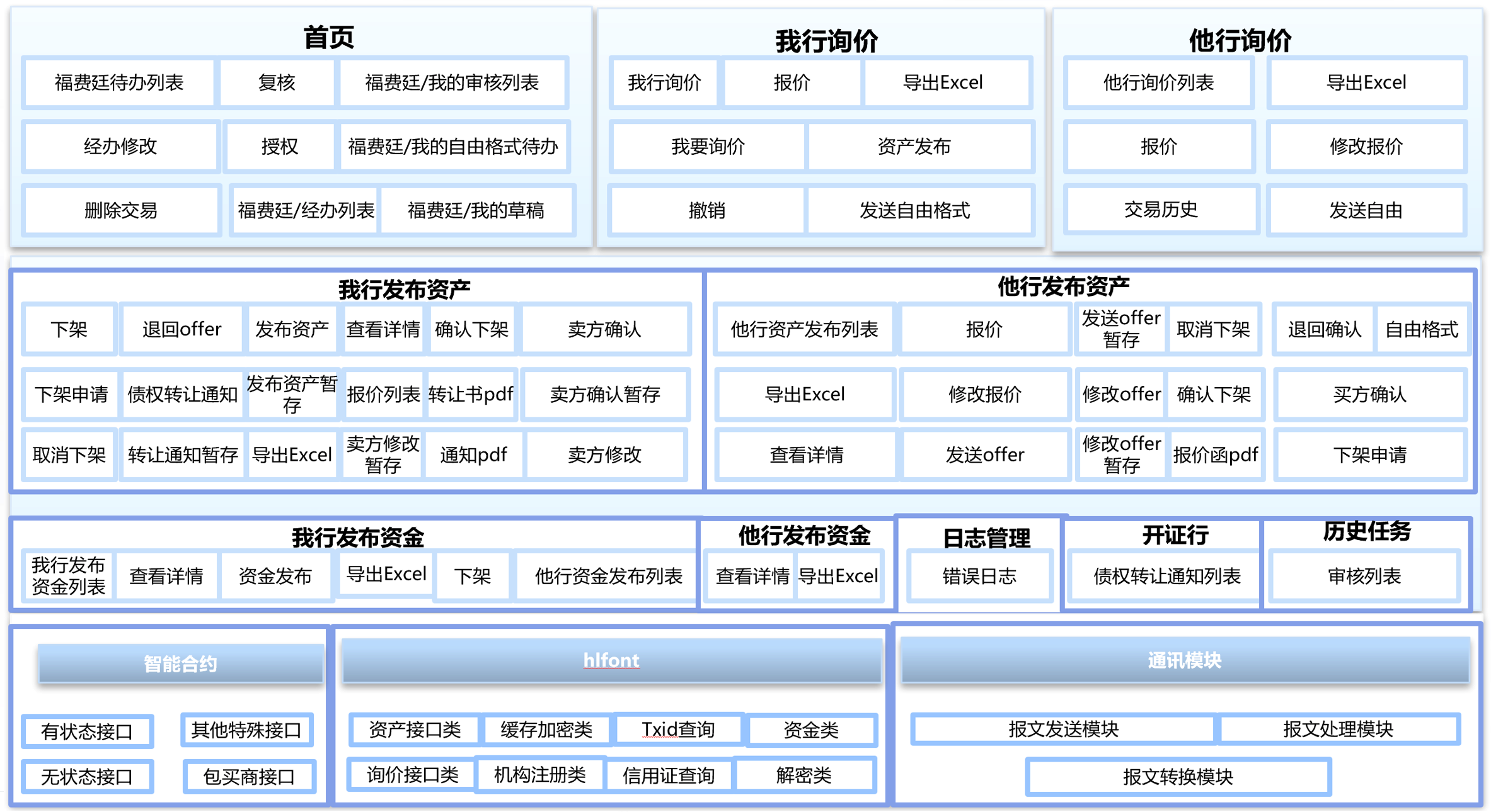 在以上国内信用证业务实现基础上,进一步实现跨行福费廷交易询、报价、撮合和债权转让等功能,替代传统的电话或微信等手工方式,保证交易全流程的自动化对接、安全可靠、清晰可追溯。