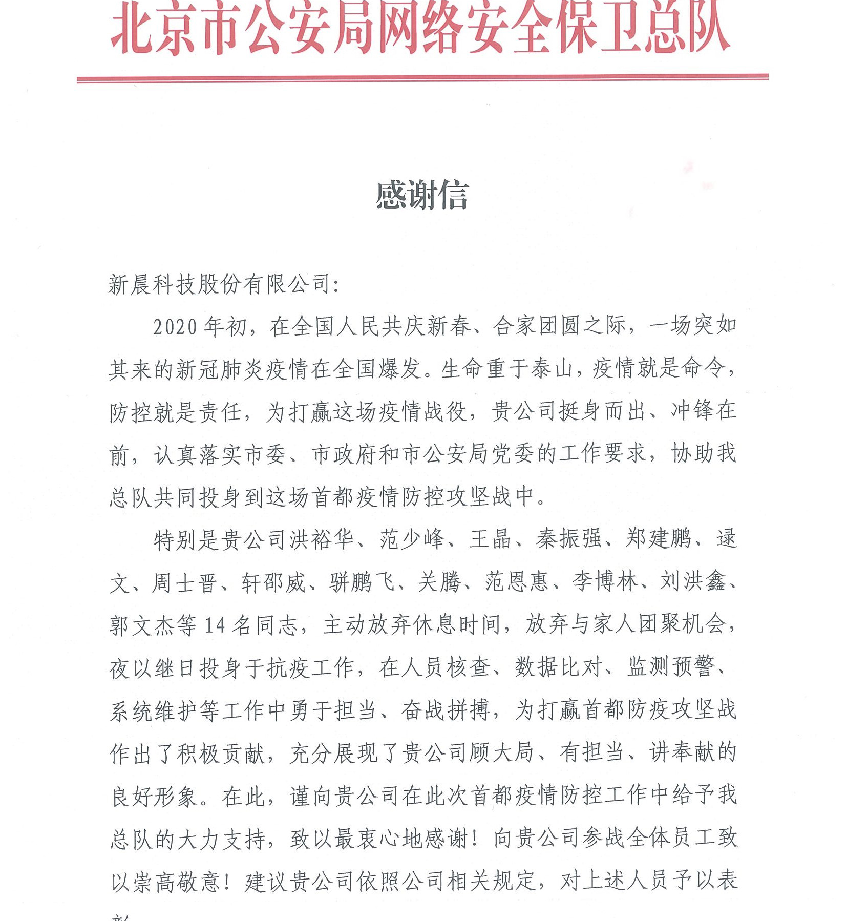 北京市公安局抗疫感谢信